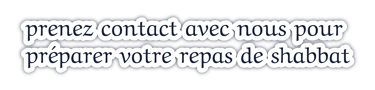 Chaque Shabbat, nous vous proposons un menu préparé avec soin. Des recettes authentiques, des produits sélectionnés avec exigence et une touche de générosité pour accompagner ce moment de convivialité, de saveurs et de sérénité autour de la table.